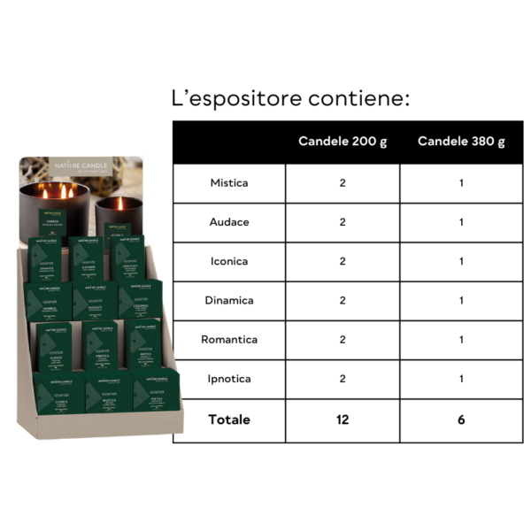 Migliora l’esperienza dei tuoi clienti con l’Espositore Candele Ambiente della Collezione Essenza di Nature Candle. Esci dagli standard e arricchisci la tua attività offrendo fragranze inebrianti, ispirate ai rinomati profumi.