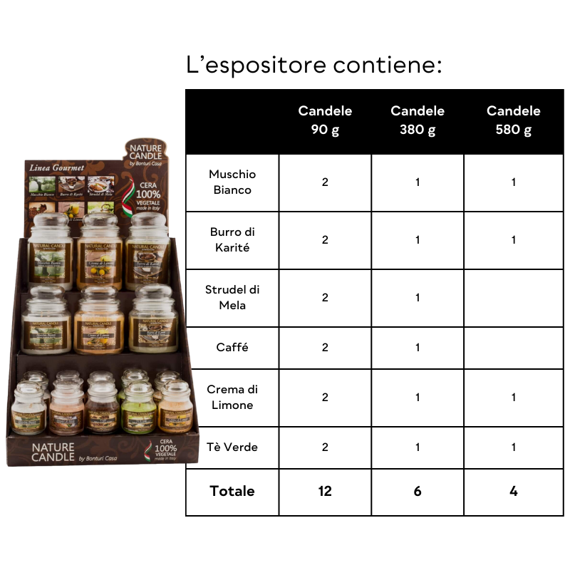 Regala momenti di piacere con le fragranze gourmet che riportano alla mente ricordi e emozioni familiari. Realizzato in robusto cartone riciclabile, dall’ingombro ridotto, è facile da montare e mette in buona luce i prodotti Nature Candle evidenziandone le principali caratteristiche: la provenienza tutta Italiana e la composizione in cera 100% vegetale. Ogni espositore contiene del materiale promozionale per la formazione e sostegno alla vendita.