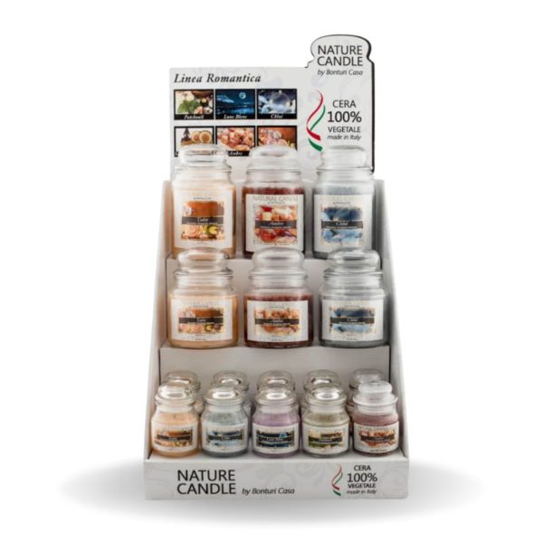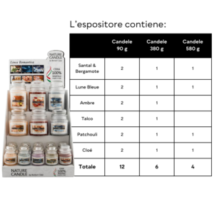 Una vetrina irresistibile per promuovere e valorizzare le fragranze che trasformano gli ambienti in esperienze avvolgenti di coccola e relax. Realizzato in robusto cartone riciclabile, dall’ingombro ridotto, è facile da montare e mette in buona luce i prodotti Nature Candle evidenziandone le principali caratteristiche: la provenienza tutta Italiana e la composizione in cera 100% vegetale. Ogni espositore contiene del materiale promozionale per la formazione e sostegno alla vendita.