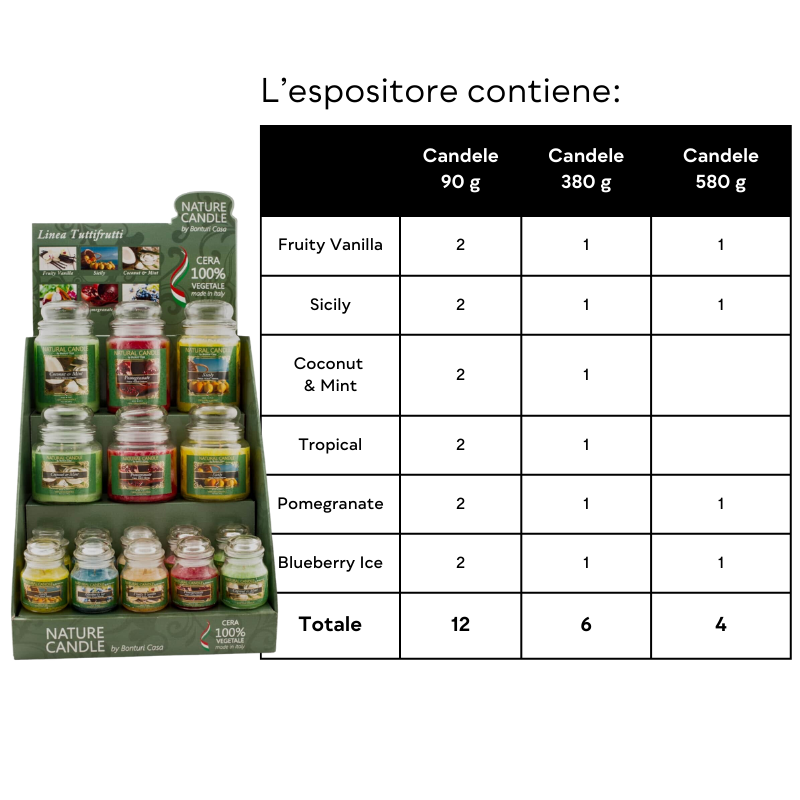 Contenuto: 12 giare da 90g (2 pz per fragranza) + 6 giare da 380g (1 pz per fragranza) + 4 giare da 580g (1 pz per fragranza, 4 fragranze miste)