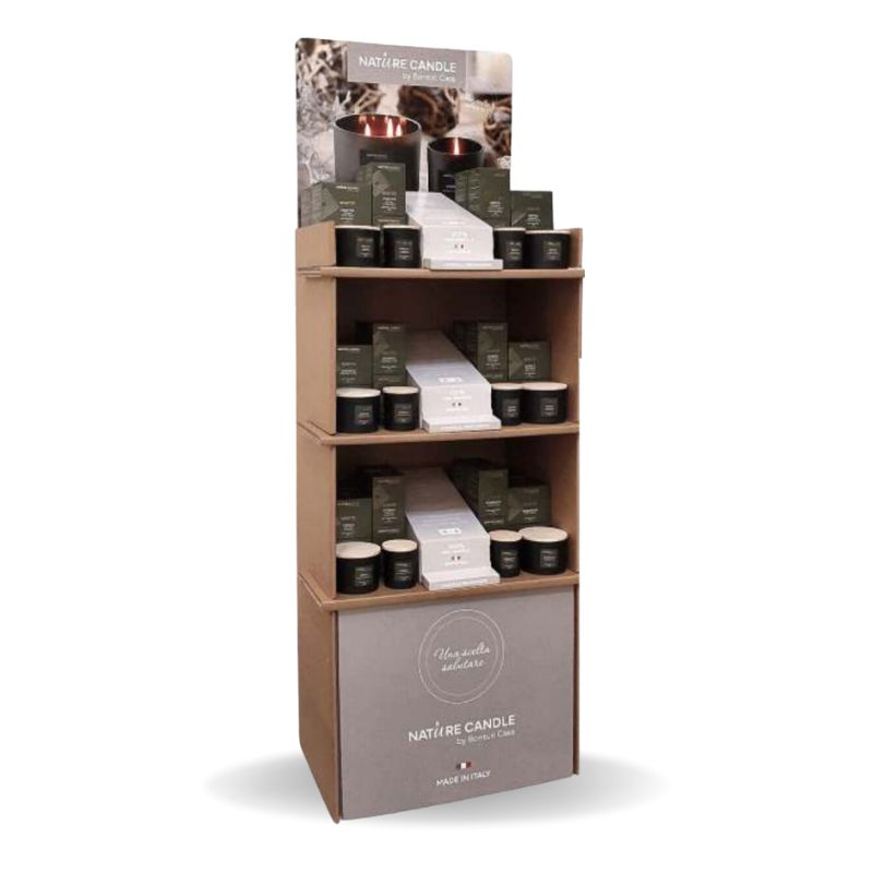 Realizzato in robusto cartone riciclabile, dall’ingombro ridotto, è facile da montare e mette in buona luce i prodotti Nature Candle evidenziandone le principali caratteristiche: la provenienza tutta Italiana e la composizione in cera 100% vegetale. Ogni espositore contiene del materiale promozionale per la formazione e sostegno alla vendita.