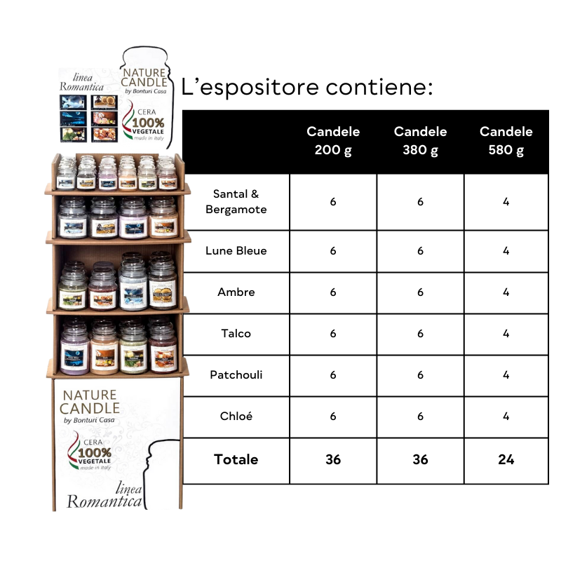 Una vetrina irresistibile per promuovere e valorizzare le fragranze che trasformano gli ambienti in esperienze avvolgenti di coccola e relax. Realizzato in robusto cartone riciclabile, dall’ingombro ridotto, è facile da montare e mette in buona luce i prodotti Nature Candle evidenziandone le principali caratteristiche: la provenienza tutta Italiana e la composizione in cera 100% vegetale. Ogni espositore contiene del materiale promozionale per la formazione e sostegno alla vendita.