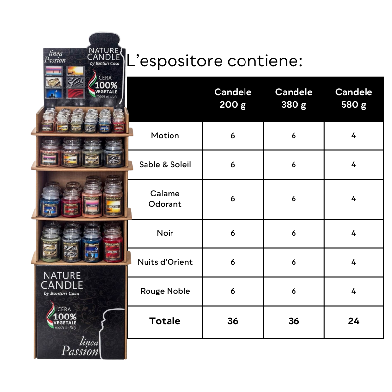 Lasciati catturare dalla selezione di candele in cera vegetale al 100%, creata per aggiungere un tocco di intensità e stile alla tua attività. Realizzato in robusto cartone riciclabile, dall’ingombro ridotto, è facile da montare e mette in buona luce i prodotti Nature Candle evidenziandone le principali caratteristiche: la provenienza tutta Italiana e la composizione in cera 100% vegetale. Ogni espositore contiene del materiale promozionale per la formazione e sostegno alla vendita.