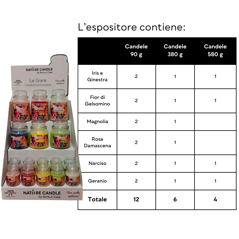 Contenuto: 12 giare da 90g (2 pz per fragranza) + 6 giare da 380g (1 pz per fragranza) + 4 giare da 580g (1 pz per fragranza, 4 fragranze miste)