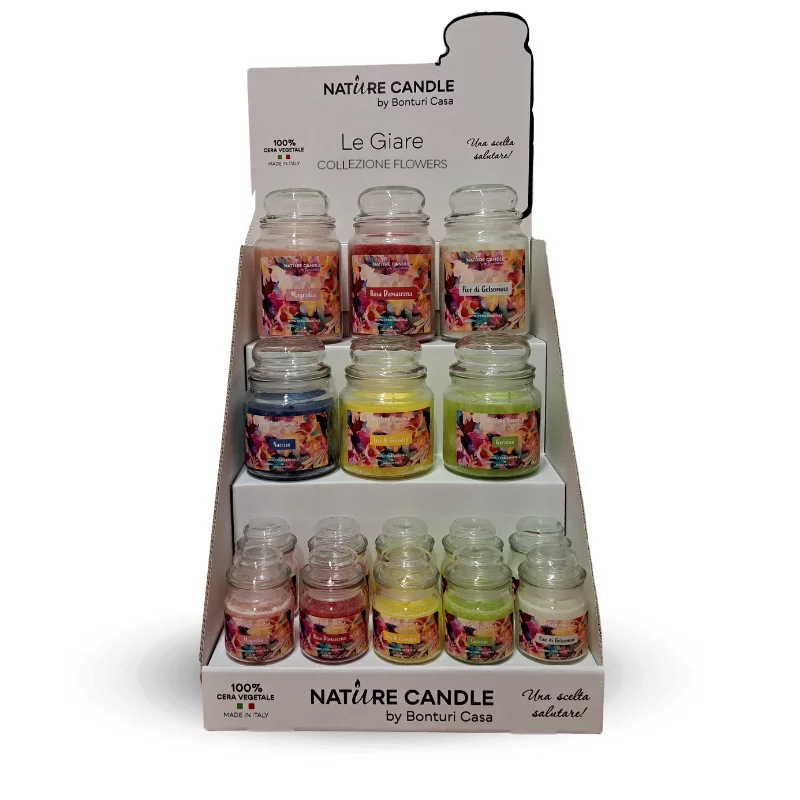 Esponi con stile le Giare Profumate in cera 100% vegetale con l’Espositore da Terra della collezione Flowers di Nature Candle. Racchiuse in eleganti giare di vetro, catturano l’essenza dei fiori appena raccolti.