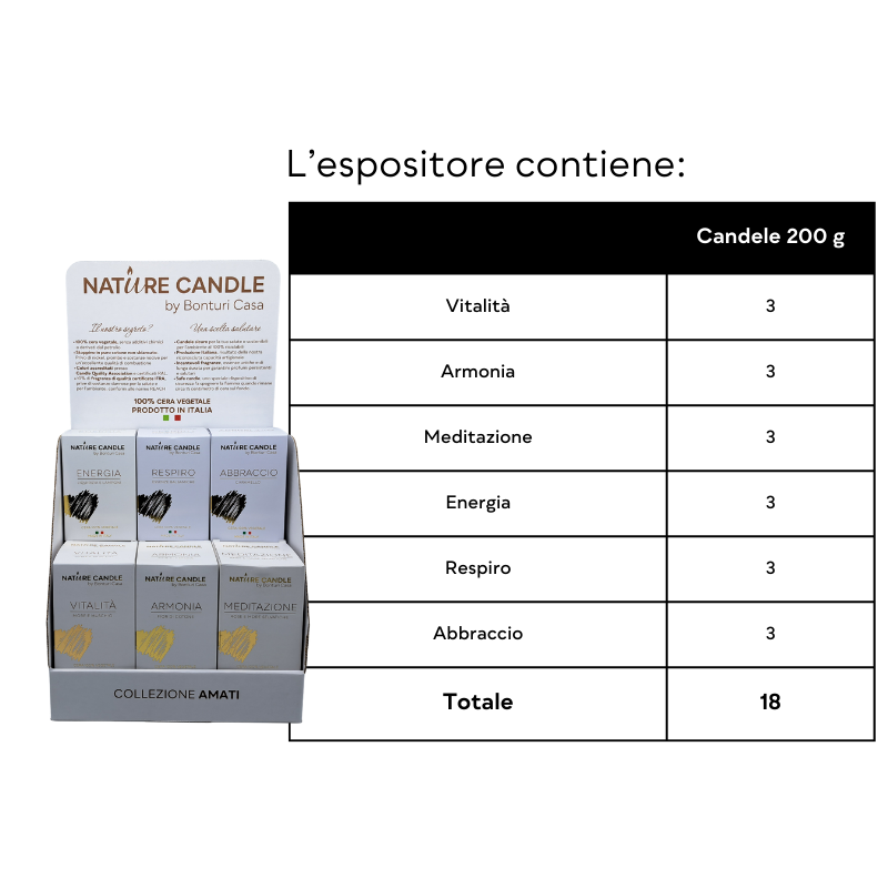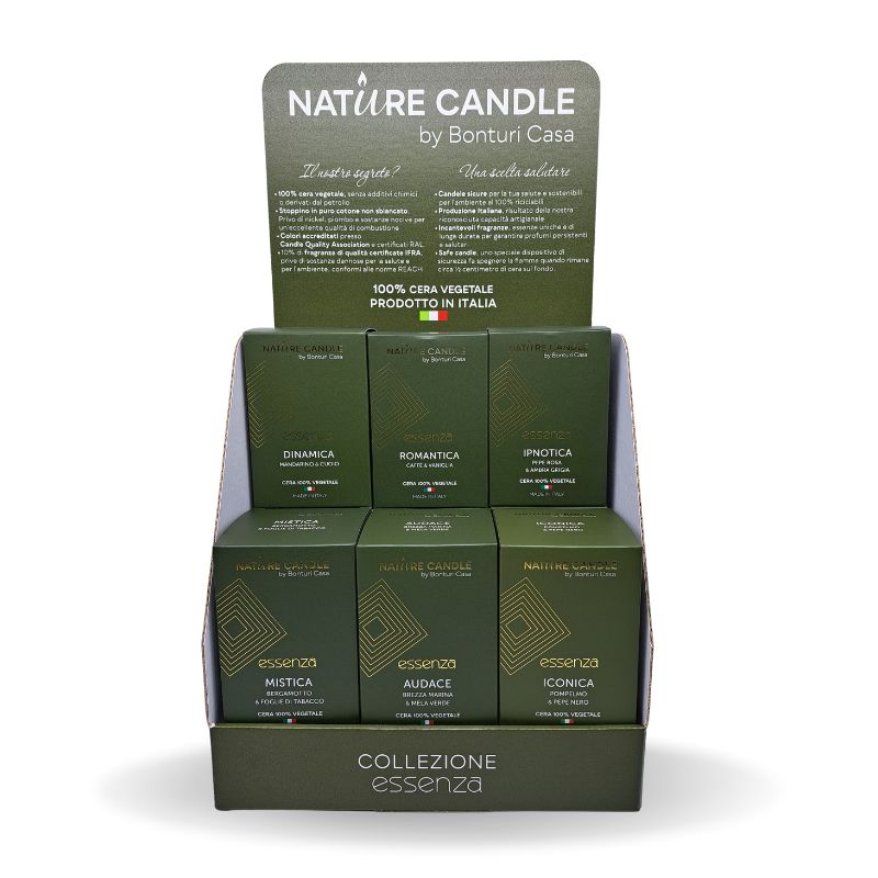 Realizzato in robusto cartone riciclabile, dall’ingombro ridotto, è facile da montare e mette in buona luce i prodotti Nature Candle evidenziandone le principali caratteristiche: la provenienza tutta Italiana e la composizione in cera 100% vegetale. Ogni espositore contiene del materiale promozionale per la formazione e sostegno alla vendita.