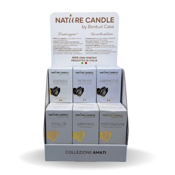 Eleva la promozione delle candele profumate con l’Espositore da banco mini della Collezione Amati di Nature Candle, pensata appositamente per SPA e centri benessere. Questo espositore esclusivo presenta candele 100% naturali. Ogni candela crea un’atmosfera unica. Dalla rilassante alla energizzante, ogni fragranza favorisce il benessere fisico e psichico, regalando un incantevole viaggio attraverso sensazioni intense e momenti di puro relax.
