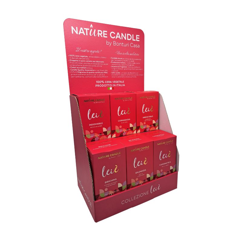Realizzato in robusto cartone riciclabile, dall’ingombro ridotto, è facile da montare e mette in buona luce i prodotti Nature Candle evidenziandone le principali caratteristiche: la provenienza tutta Italiana e la composizione in cera 100% vegetale. Ogni espositore contiene del materiale promozionale per la formazione e sostegno alla vendita.
