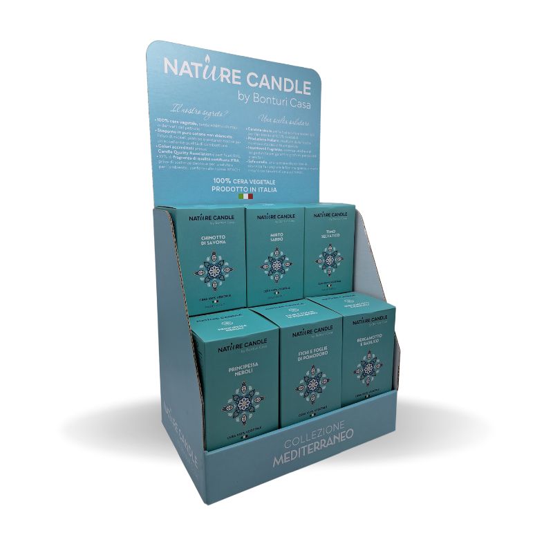 Realizzato in robusto cartone riciclabile, dall’ingombro ridotto, è facile da montare e mette in buona luce i prodotti Nature Candle evidenziandone le principali caratteristiche: la provenienza tutta Italiana e la composizione in cera 100% vegetale. Ogni espositore contiene del materiale promozionale per la formazione e sostegno alla vendita.