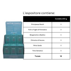 Valorizza le candele in vendita nella tua attività con l’Espositore da Banco della Collezione Mediterraneo di Nature Candle. Mostra con eleganza la bellezza delle candele ispirate al Mediterraneo, catturando l’essenza degli agrumi e della brezza marina.