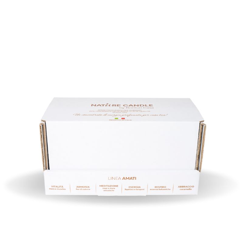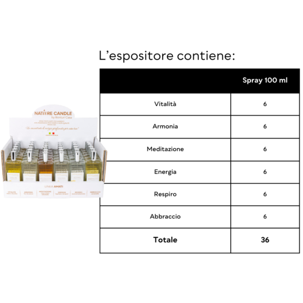 Valorizza gli Spray Ambiente Naturali con l’Espositore Spray Ambiente della Collezione Amati di Nature Candle. Questo elegante espositore presenta gli spray che diffondono delicate fragranze, creando un’atmosfera avvolgente e accogliente nell’ambiente. Invita i tuoi clienti a scoprire l’arte di creare momenti memorabili con le fragranze raffinate e sofisticate della collezione “Amati”.